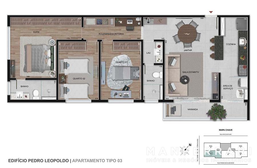 • Sala de estar/TV; sala de jantar; varanda; circulação; suíte com closet e banheiro