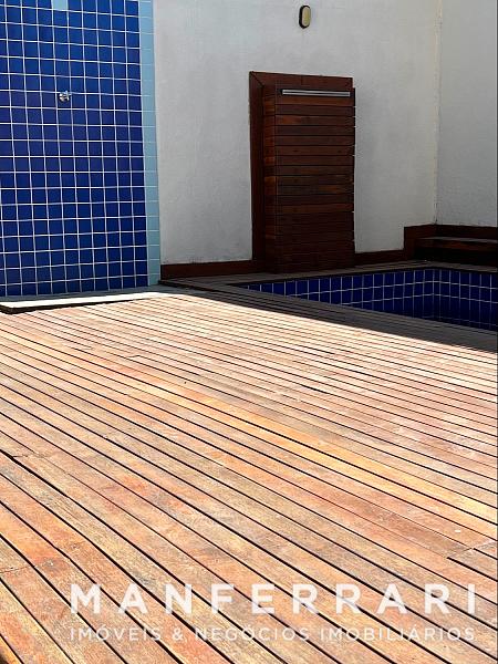 • Quintal com arvores frutífera, piscina e deck em madeira e ducha.